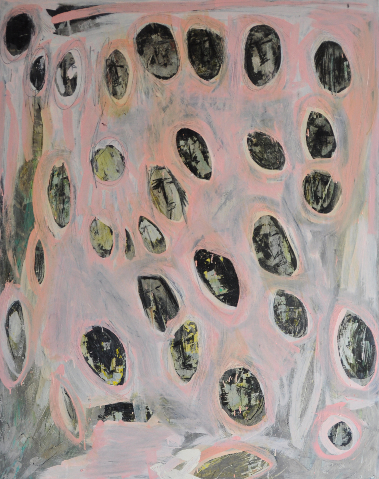Pressing at and running over the edges, strokes and swathes of pigment form irregular patterns that squeeze, swell, intensify, and grow. Simultaneously constricted and expanding, the gathering of gestures is emerging and unstable, assertive and elusive. Berg grapples with his canvases, as he adds and subtracts elements over time. He explores the full possibilities of acrylic, oil, and house paints as they are smeared, scraped, smudged, and splotched. The dynamic teeters between flow and entanglement, as the surface both obscures and suggests what lies beyond.