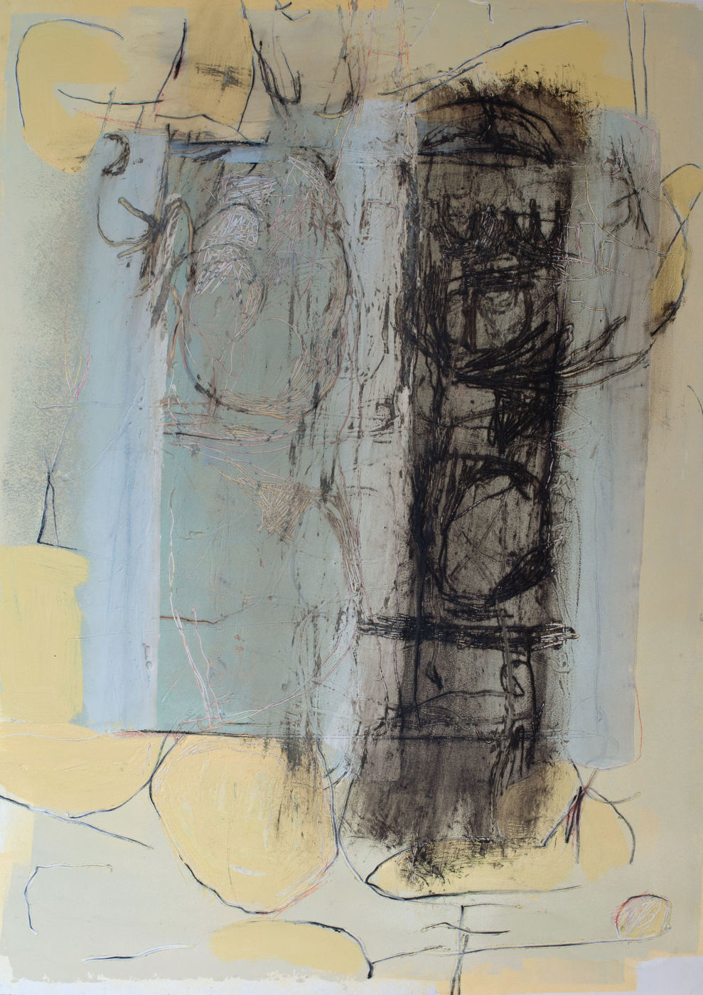 While color often describes, Berg exploits its capacity for suggesting space and movement, light and substance. Shunning easy relationships, Berg selects colors that startle, juxtaposing pretty with jarring, lyrical with violent, emotional with contemplative. A palette of pastel blue, yellow, pink, and green recalls a sensuous rococo painting and conjures the feminine. Yet pink can play against type and becomes raucous even intimidating. His blacks and whites embody the underlying yin and yang, but they are laden with emotional, associative content.